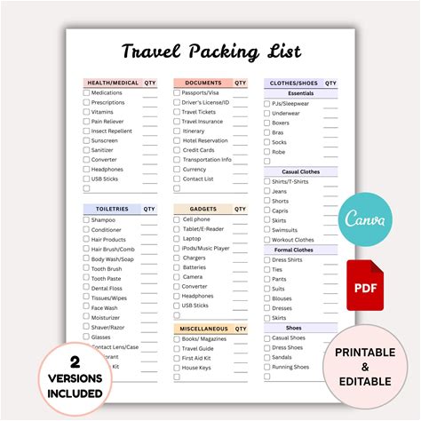 Travel Packing Checklist: 3 Pages Printable List (editable Canva Tem