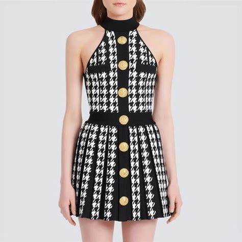Spring And Autumn 2022 New Style Necked Sleeveless Pleated Dress Classic Houndstooth Lion Button