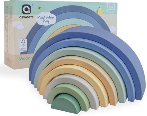Asweets Wooden Stackable Rainbow Toy, 8 PCS Wooden Building Blocks Set For 1 2 3 Baby, Kids And Toddlers, Montessori Rainbow Nesting Puzzle, Best For